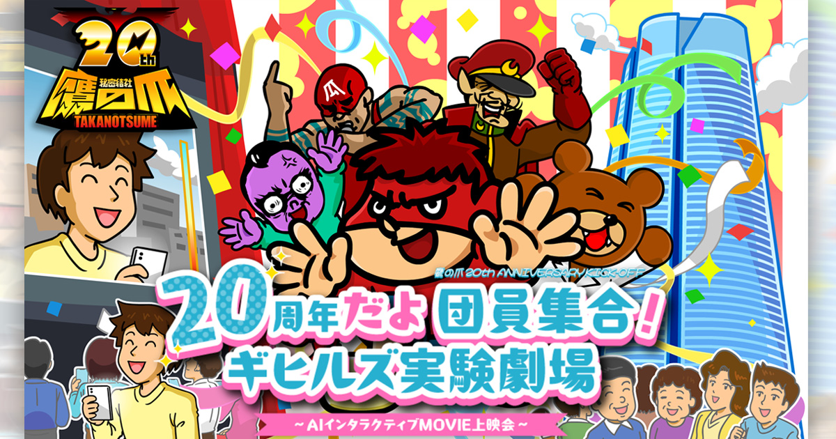 鷹の爪 20th ANNIVERSARY KICK-OFF 『20周年だよ 団員集合!ギヒルズ実験劇場 〜AIインタラクティブMOVIE上映会〜』【第1部】 開催日 2026年1月10日(土) 時間 開始:14: 場所 TOHOシネマズ六本木ヒルズ(東京都) 価格 無料 出演者 FROGMAN, 他 公式サイト https://www.toho-marketing.com/takanotsume-kickoff/ チケット情報 参加方法 【発売日】 ~ 2025年12月15日(月) 23:59 下記の注意事項をお読みになり、同意された方は下記の応募フォームより必要事項を入力の上、ご応募ください。各回毎抽選を行い、当選者には後日当選メールをご送付致します。応募締め切り:2025年12月15日(月)23:59まで当選者の方には、2025年12月22日(月)にご登録のメールアドレスにご連絡申し上げます。当選・落選に関するお問い合わせにはお答えできませんので、予めご了承ください。