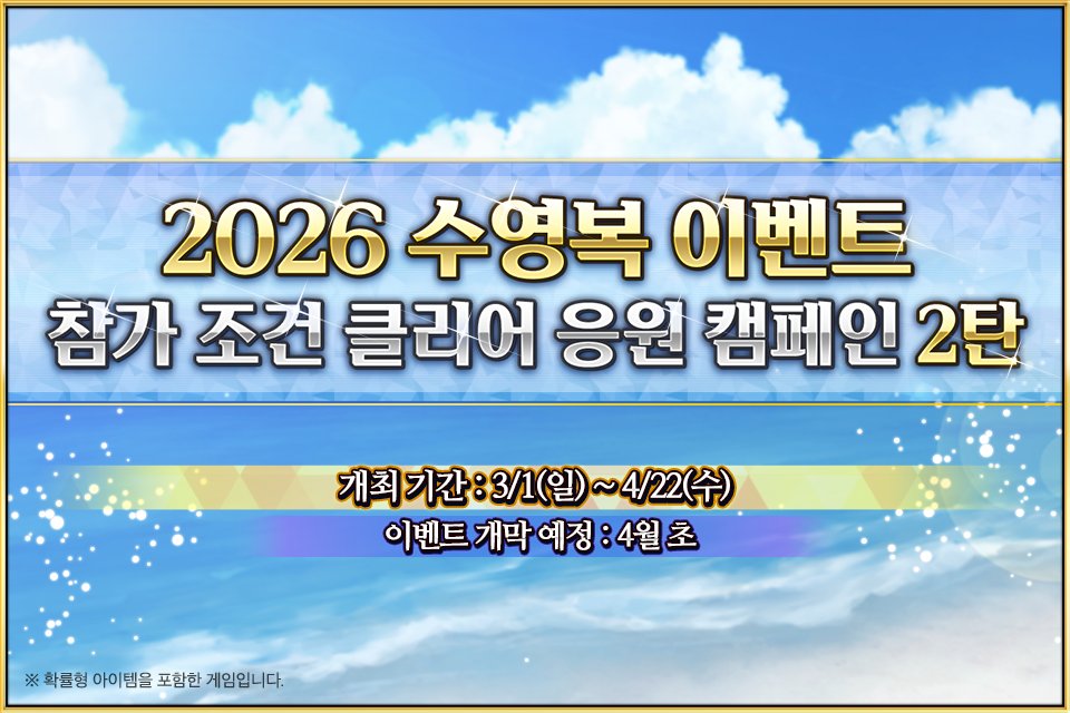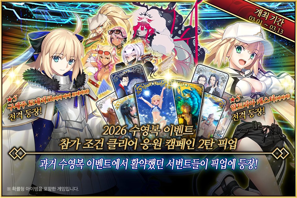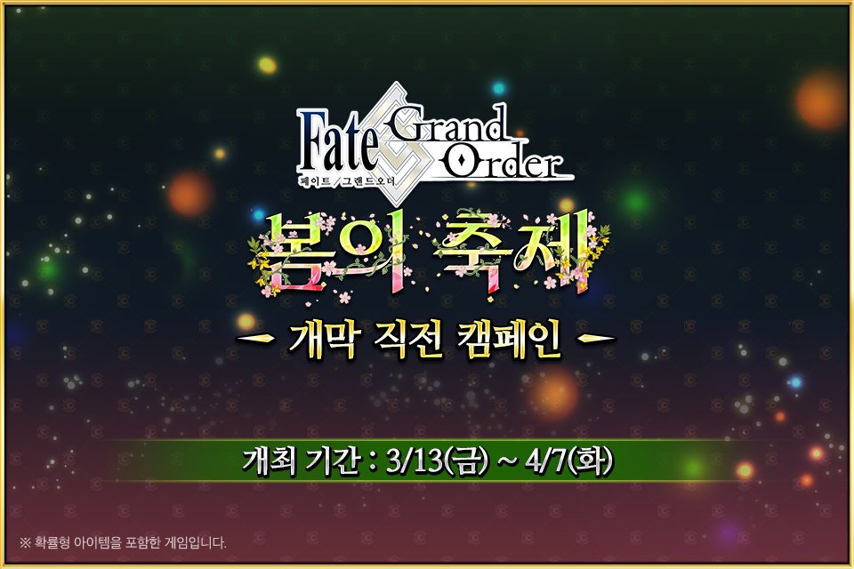 3/13(금) <봄의 축제 개막 직전 캠페인> 개최 예정! 2026년 4월 예정인 <2026 봄의 축제 캠페인>의 개최를 기념하여 특별한 로그인 보너스는 물론 '2026 봄의 축제 영령박장 티켓'을 획득할 수 있는 파빌리온 퀘스트와 그와 관련된 특별 미션 등, 다양한 캠페인을 실시합니다! ▶https://cafe.naver.com/fategokr/4376401 #FGO #한그오 #페그오 #봄의축제 #개막직전 #캠페인