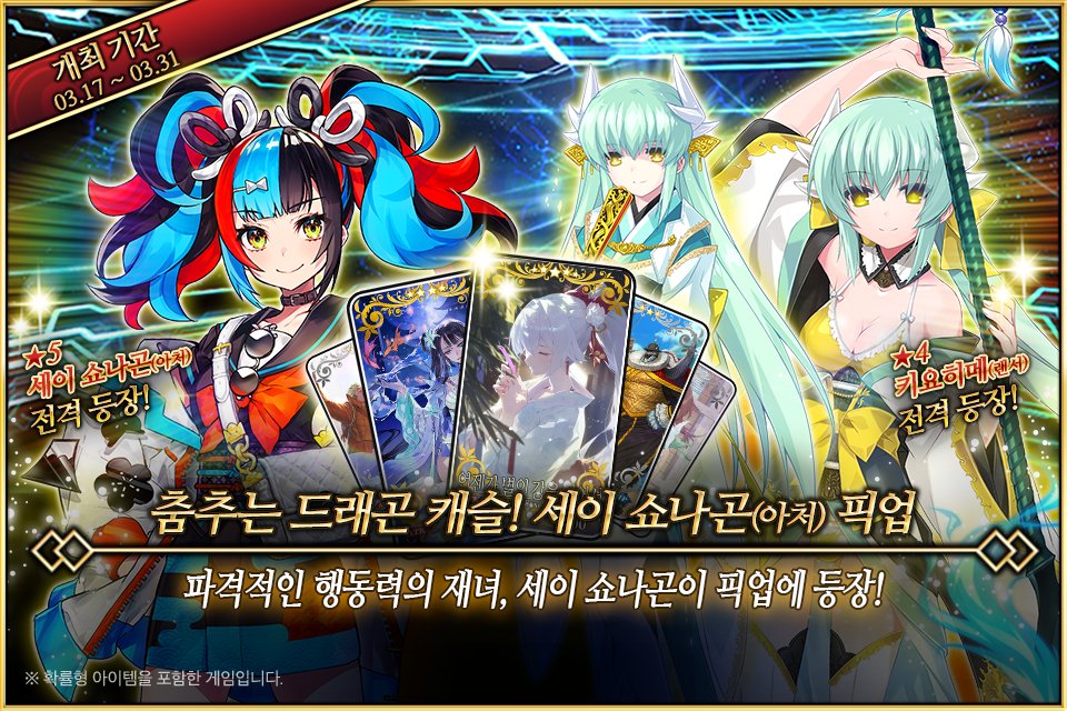 3/17(화) <춤추는 드래곤 캐슬! 세이 쇼나곤(아처) 픽업> 개최 예정! 특별 등장 서번트 ★5 세이 쇼나곤(아처)을 포함한 3기의 서번트와 이벤트 진행에 도움이 되는 특별 등장 개념예장 3종을 픽업 소환합니다! ▶ https://cafe.naver.com/fategokr/4377124 #FGO #한그오 #페그오 #쇼나곤 #픽업 https://t.co/hGalGgKJaf