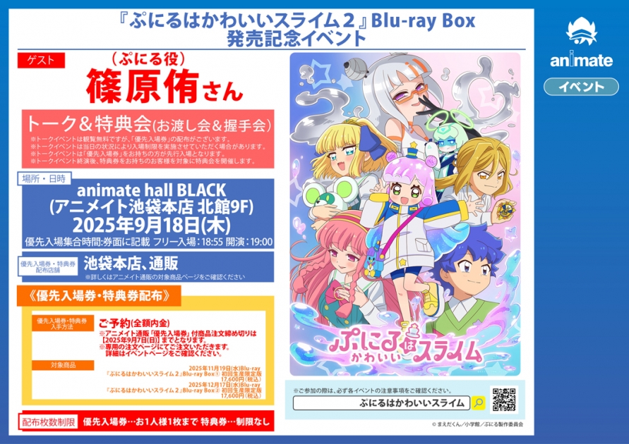「ぷにるはかわいいスライム」第2期Blu-ray BOX発売記念イベント 開催日 2025年9月18日(木) 時間 開始:19: 場所 animate hall BLACK(アニメイト池袋本店 9F)(東京都) 出演者 篠原侑(ぷにる役) 公式サイト https://www.animate-onlineshop.jp/contents/fair_event/detail.php?id=113525 チケット情報 参加方法 【発売日】 2025年7月6日(日) 12:00 ~ ○お渡し会&握手会についてフリートークイベント終了後にお渡し会&握手会を実施致します。下記対象商品のいずれか1点を対象店舗にてご予約(全額内金)いただいたお客様に、先着で「優先入場券」と「特典券」をお渡しします。・特典会内容:サイン入り描き下ろしジャケット絵柄特製ポストカードお渡し会&握手会【対象商品】「ぷにるはかわいいスライム2」Blu-ray BOX① 品番:TBR35114D「ぷにるはかわいいスライム2」Blu-ray BOX② 品番:TBR35115D【対象店舗】アニメイト池袋本店、通販