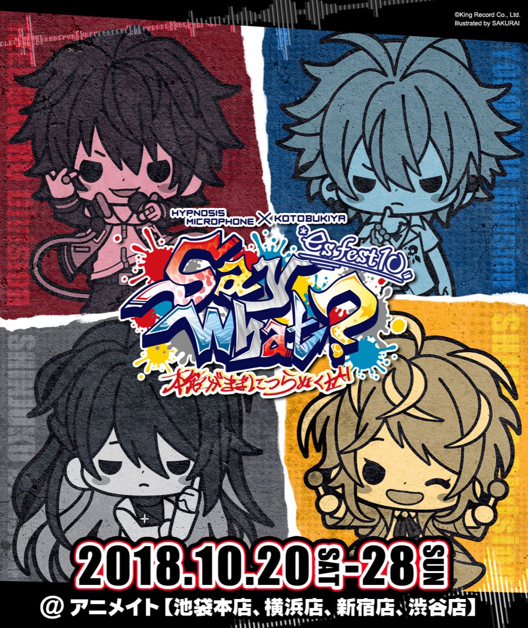 大人気「ヒプノシスマイク -Division Rap Battle-」× コトブキヤ es fest10 in アニメイト池袋・横浜・新宿・横浜にて10月20日〜10月28日まで「Say what!? 本能がままにつらぬくぜ」グッズコラボ開催!各ディビジョンをイメージしたオリジナルグッズが登場!開催期間は2018年10月20日〜10月28日まで! 記事内ナビゲーション ヒプマイメニューを見る ノベルティーを見る 開催概要を見る ヒプノシスマイク × コトブキヤ es fest10 in アニメイト池袋・横浜・新宿・渋谷のグッズ コトブキヤの「es fest10」では大人気「ヒプノシスマイク」の描き下ろしイラストを使用した「ヒプマ」グッズがアニメイトのイケブクロ・ヨコハマ・シンジュク・シブヤに登場!! ※画像をタップすると拡大、拡大後ダブルタップするとさらに拡大出来ます。 八角形缶バッジ、BIGラバーストラップ、ネックストラップ※購⼊制限: お一⼈様につき、3セットまで" >ディビジョン セット「イケブクロ」2,500円八角形缶バッジ、BIGラバーストラップ、ネックストラップ※購⼊制限: お一⼈様につき、3セットまで 八角形缶バッジ、BIGラバーストラップ、ネックストラップ※購⼊制限: お一⼈様につき、3セットまで" >ディビジョン セット「ヨコハマ」2,500円八角形缶バッジ、BIGラバーストラップ、ネックストラップ※購⼊制限: お一⼈様につき、3セットまで 八角形缶バッジ、BIGラバーストラップ、ネックストラップ※購⼊制限: お一⼈様につき、3セットまで" >ディビジョン セット「シンジュク」2,500円八角形缶バッジ、BIGラバーストラップ、ネックストラップ※購⼊制限: お一⼈様につき、3セットまで 八角形缶バッジ、BIGラバーストラップ、ネックストラップ※購⼊制限: お一⼈様につき、3セットまで" >ディビジョン セット「シブヤ」2,500円八角形缶バッジ、BIGラバーストラップ、ネックストラップ※購⼊制限: お一⼈様につき、3セットまで 購⼊制限:お一⼈様につき、30個まで" >ラバーストラップコレクション 600円 ※ランダム購⼊制限:お一⼈様につき、30個まで 購⼊制限: お一⼈様につき、30個まで" >デコキラ☆バッジコレクション 400円 ※ラン
